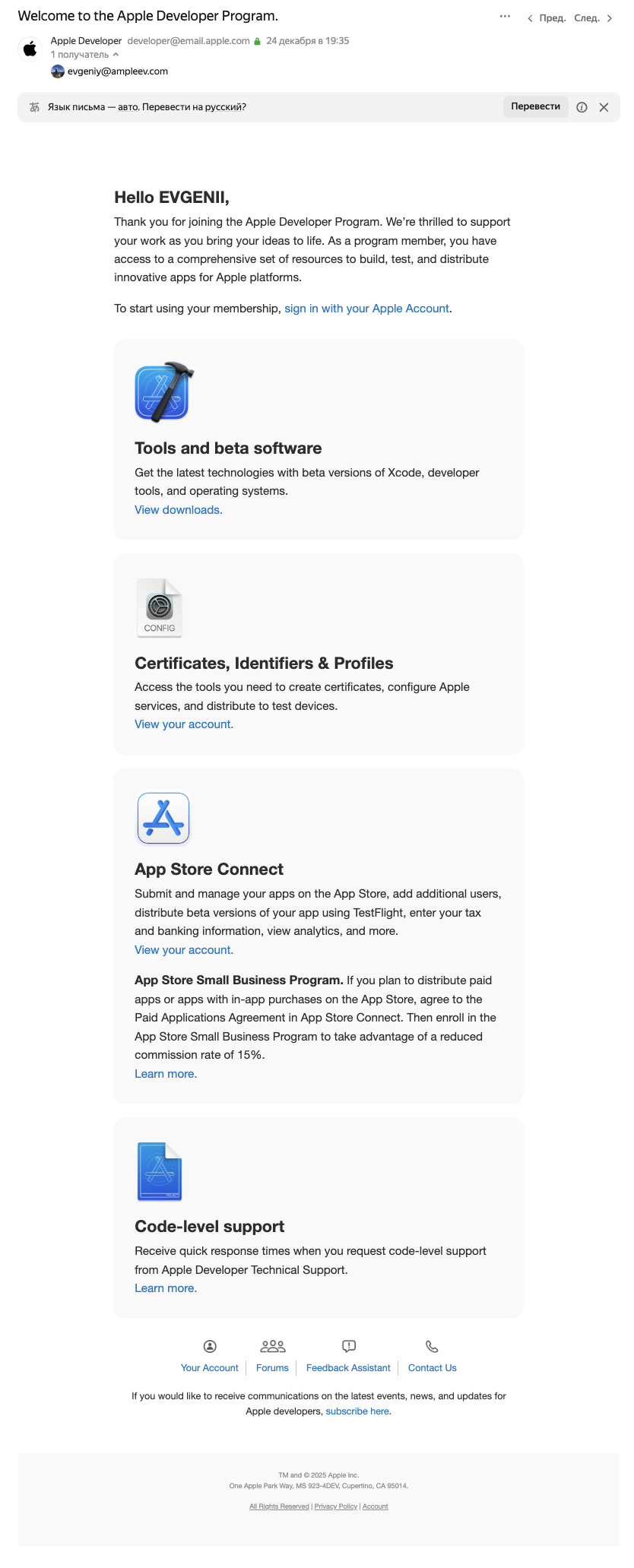 доступе к TestFlight, App Store Connect, бета-версиям Xcode и программам поддержки.